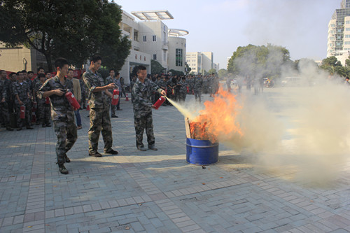 此次消防演练由保卫处组织,参演人员主要为各商铺工作人员、食堂工作人员、辅导员、宿管员、12级军训教导队成员。演练开始前先由保卫处专职消防员对参演人员进行讲解、示范,接着组织参演人员分批次、分组进行实战演练。此次演练的主要内容为干粉灭火器操作使用、如何扑灭初期水灾等。